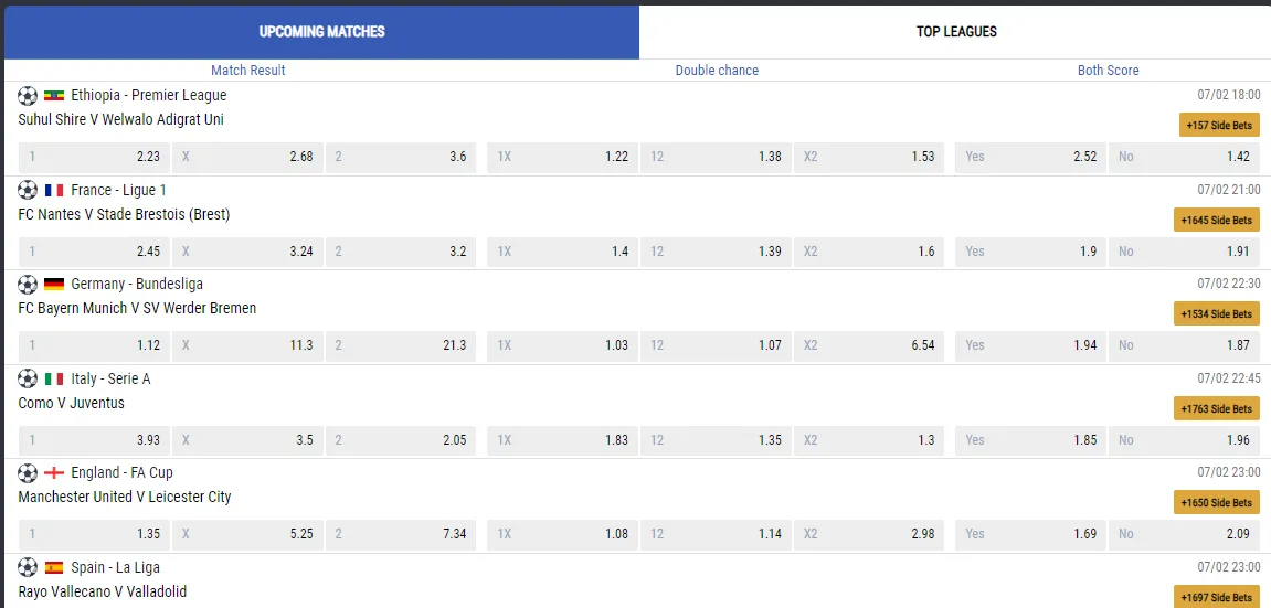 Each of these activities is linked to a certain number of events. As you click on the sport, the events are about to unfold. For example, you will see such options as UEFA Champions League, Premier League (Ethiopia), FA Cup (England), and more as you access football. Those who choose volleyball can place bets in connection with CEV Cup Women, Liga Pro Women (Russia), etc.